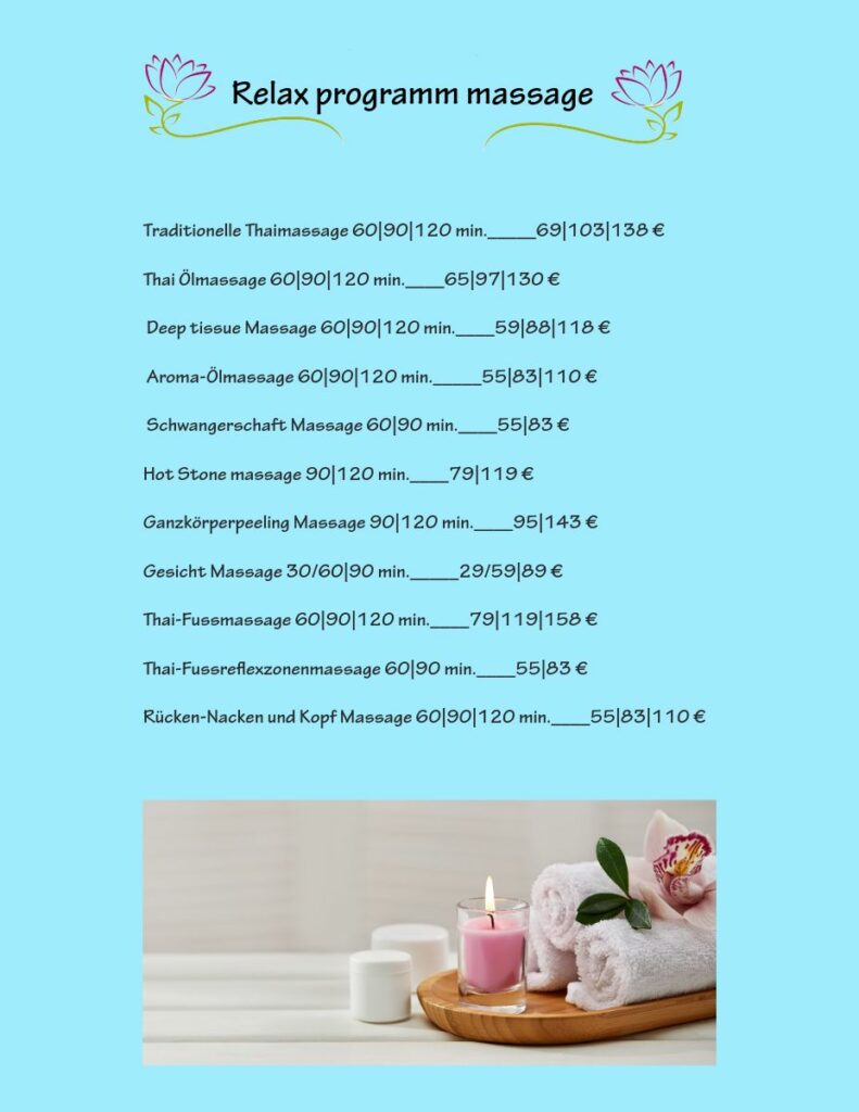 Unten sehen Sie die Liste der möglichen Dienstleistungen. Wählen Sie die Massage aus und reservieren einen verfügbaren Termin.Sie bekommen per Email eine Bestätigungsmail. Bitte den Link in der Email nutzen, um den Termin zu verschieben, Weiterlesen…